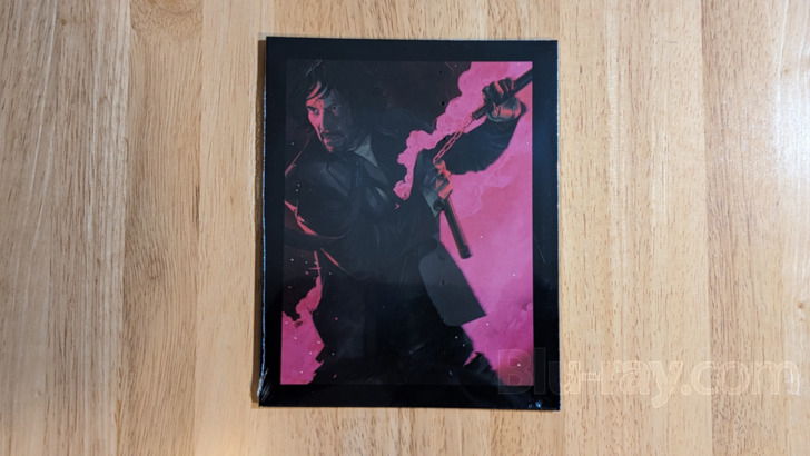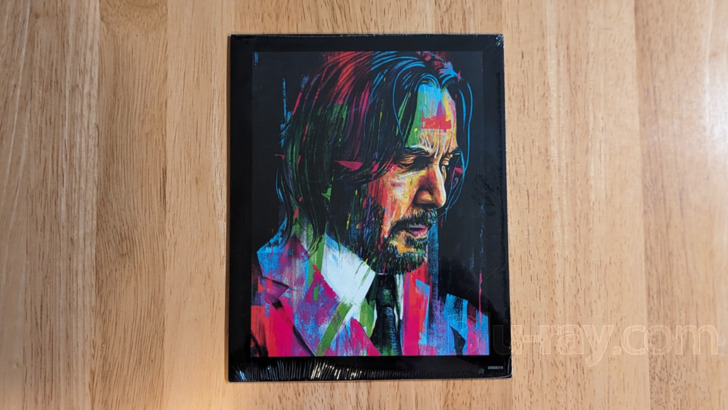 On disc supplements are detailed in the above linked reviews. This features a multi-disc keepcase (see the seventh photo I've uploaded to accompany this review for a peek at how the discs are stacked) which features a striking purple cover rendering of John. The same rendering is one of two offered (back to back) as a kind of insert that fits over the keepcase but inside the slipbox, which has a window in the front (surrounded by a rather nicely filagreed border) revealing whatever image has been chosen (see the fourth and fifth photos for the options). I frankly prefer the second illustration, a multi-colored sketch of John that kind of reminded me of Leroy Neiman's inimitable work. Additionally, DVD and digital copies are included.