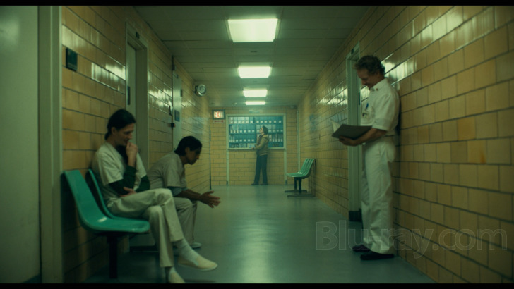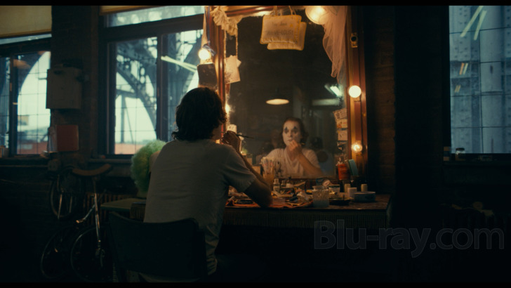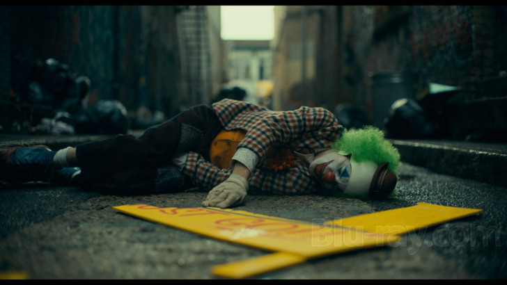 This two-disc set comes in very striking Steelbook packaging with a bold image of Joker that blends into a similarly illustrative depiction of those imposing steps seen several times during the film. It's set against a vivid yellow backdrop that offers strong contrasting color values, with the solid yellow continuing on the spine and back cover. The logo is printed vertically on the spine in keeping with almost every other edition of this film, but sadly the back cover is devoid of any other design elements except for film credits. Inside is a familiar profile image of Joker applying his makeup which has likewise been used for previous releases. Both discs sit on overlapping hubs on the right-hand side.
