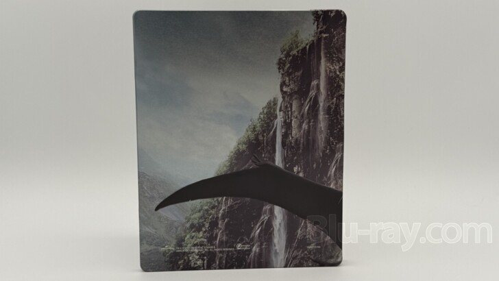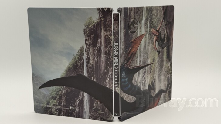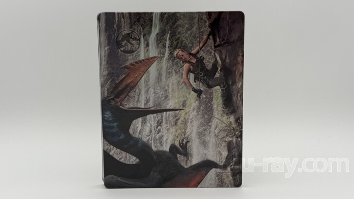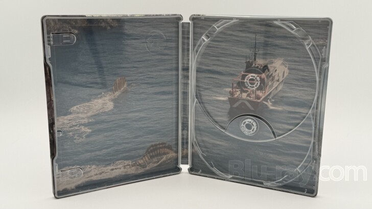 The cover the new Jurassic World: Rebirth 4K SteelBook features Scarlett Johansson's Zora repelling down a cliff and coming face to face with a massive Mutadon (a Pteranodon-Velociraptor hybrid). Waterfalls stream down behind her, and plant life punctuates the grey, rocky surface. Johansson's face and bare arms are clearly visible, standing out in stark contrast from the more drab earth tones that comprise her costume elements and the cliff. As for the Mutadon, its yellowish beak and the bright blue banding on its neck pop nicely. Just above the Mutadon's head, the franchise's logo is debossed into the cover. The spine, which continues the front image, sports the film's title in white letters and is consistent with the font used for the franchise. It's centered on the spine, while Universal's logo sits at the bottom. The back cover finishes the image, with the Mutadon's wing standing out dramatically against the cliff face which vanishes into the distance. Logos for Universal, Amblin, and a copyright statement appear in white in the lower left corner, while a product number is found in the lower right. Skies above the cliff are accentuated with bursts of gunmetal blue. When fully opened, it's an excellent dramatic image. The SteelBook has a glossy finish which is quite striking, but collectors are advised to handle it with appropriate caution and care. Opening the SteelBook, the Digital Code rests under the two tabs on the left side. On the right side, the 4K UHD disc and Blu-ray are stagger-stacked, each on its own hub, with the 4K UHD disc on top. Removing the discs and the Digital Code reveals a panoramic inner print of two of the massive Spinosauruses pursuing Duncan's boat, The Essex, as Zora's team along with the rescued Delgado family race toward the safety of the island. The scene is an early dramatic highlight.