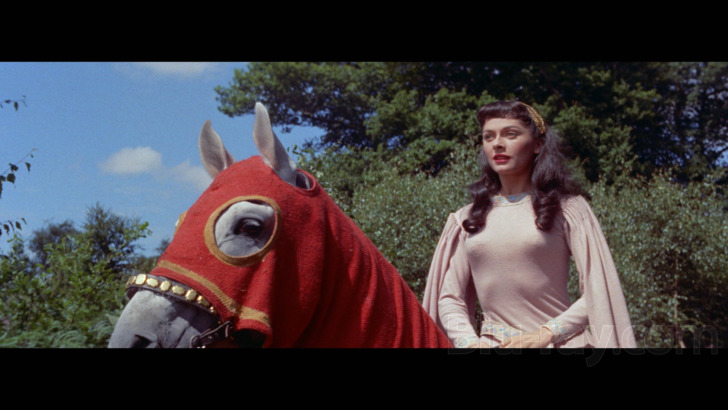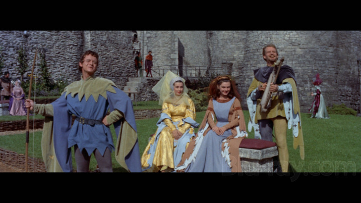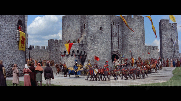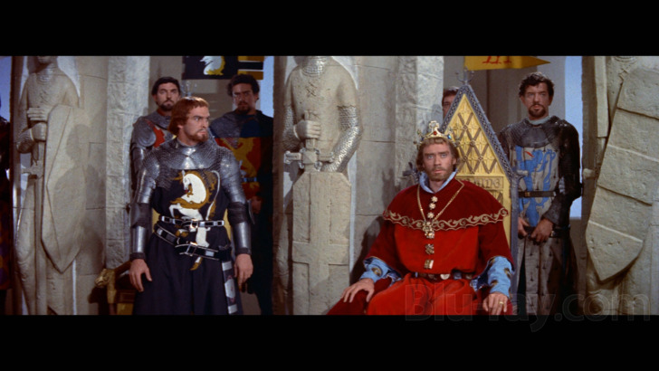 NOTE: As was common for films made decades before the modern digital and "seamless green screen" period, many scenes in Knights of the Round Table were composed optically; this meant that actors (and sometimes key foreground and background elements) were first filmed against a solid black or white backdrop and then superimposed on top of a separately-filmed "deep" background image, and the end result was cut into the original negative. Occasionally and for various reasons, seams were left showing in the form of outlines and other imperfect edges, which are of course a bit more visible when high-resolution 4K scans of the negative are involved. Though many are virtually undetectable, the opening "Excalibur" scene (as seen in screenshot #7) features fairly visible edge imperfections, as do a few others along the way. Since these elements are "baked in", they don't affect the Blu-ray's well-earned 5/5 score.