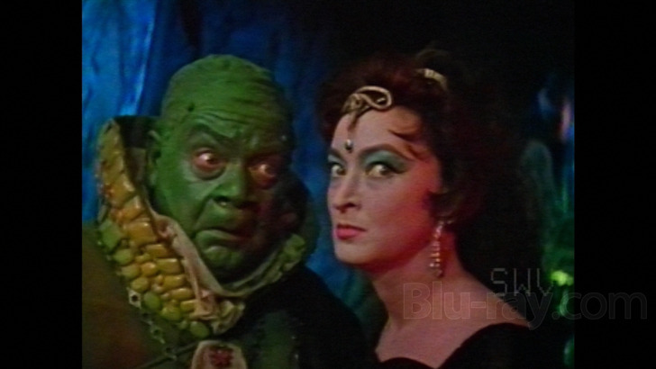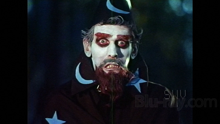 The image presentation (1.33:1 aspect ratio) for the films included on the "Krazee Kidz Video Party" are "preserved from the original 1990s Something Weird S-VHS tape masters." The viewing experiences maintain a very video-like appearance, and fine detail isn't an option here. However, a general sense of frame information remains available, exploring low-budget fantasy realms. Color isn't sharp, but, again, it basically reaches the limits of the source material, maintaining a bit of brightness with bolder primaries and unusual makeup additions. Damage is present throughout each offering, finding discoloration, video anomalies, missing and jumpy frames, and general wear and tear present. And the Something Weird watermark is visible on everything.