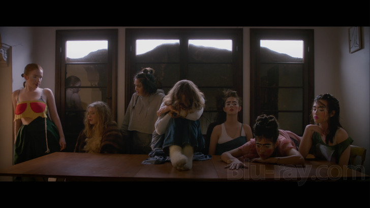 The highlight of Ladyworld's Blu-ray release is undoubtedly its DTS-HD Master Audio 5.1 surround track. I took my swing at the film's sound design earlier, but whether you find it irritating or effective is irrelevant. Cleopatra's lossless offering does every beat and scream of the soundscape proud. Dialogue is crystal clear and intelligible at all times, even when voices are hushed or when the nature of the space is given permission to pull lines away from the center channel. LFE output is utilized sparingly but when it kicks it kicks, adding room-rattling power to the earthquake early on and, later, wince-inducing brutality to some of the physical assaults. The real standout, though, are the rear speakers, which not only forge a convincing, immersive soundfield but also create a claustrophobic house that sounds as authentic as it should. It's even possible to detect subtle nuances and differences between the rooms; larger or smaller, cramped or vacant, full of chaos or quiet and calm. Ambience is terrifically detailed, pans are swift and smooth, and each directional effect originates and arrives precisely where it's meant to. The music -- divisive as it will prove -- also spreads the girls' chants and intonations around each space, surrounding the listener with oppressive and aggressive vocalizations and chorus runs (as is intended). All told, Ladyworld's lossless audio track sounds fantastic.