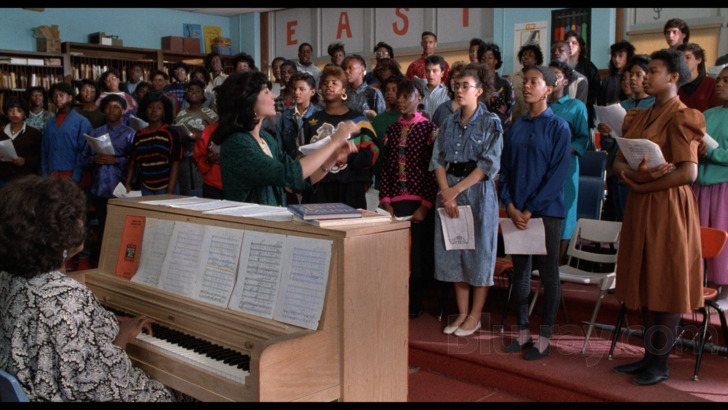 Soon enough, Clark strides into the graffiti-strewn hallways and institutes sweeping changes, beginning with a school-wide assembly where roughly 300 of the biggest "problem kids" are expelled with a wave of his hand. The rest are put on short notice, ordered to fall in line immediately or suffer the consequences. Padlocks are put on all the doors during school hours to discourage unwanted entry and exit. Educators and administrators alike including English teacher Larry Darnell (Michael Beach) and vice principal Joan Levias (Beverly Todd) aren't spared either, harshly reprimanded in full view of their colleagues and students with some threatening to resign after weeks of continued abuse. Kids are even forced to memorize the school song and perform it on demand. Lean on Me? More like Bow to Me.