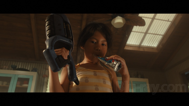 Lilo & Stitch is presented on Blu-ray courtesy of Disney / Buena Vista with an AVC encoded 1080p transfer in 2.39:1. The IMDb lists the Arri Alexa 35 and a 4K DI as the relevant data points. The blending of CGI and what I might pointedly call actual live action is largely (if not totally) seamless, but kind of interestingly there may be a trade off of sorts between the presentations in 1080 and 4K UHD that Disney / Buena Vista are offering with this film. The 4K version probably undeniably ups the precision of fine detail on things like Stitch's fur (or even some of the "slimier" aliens), but the increased resolution of that format probably equally unavoidably makes the use of CGI more noticeable. That may make this 1080 version actually preferable for some, at least those sticking to the "live action remake" line (that's a joke). Fine detail on all the practical sets and costumes is excellent throughout the presentation (and in sometimes highly variant lighting conditions). The palette is also gorgeous throughout, and the outdoor location work in Hawaii is especially resplendent.