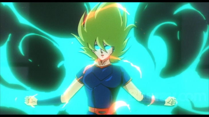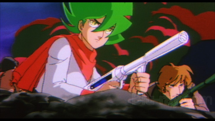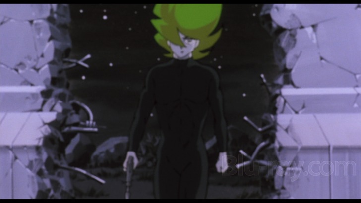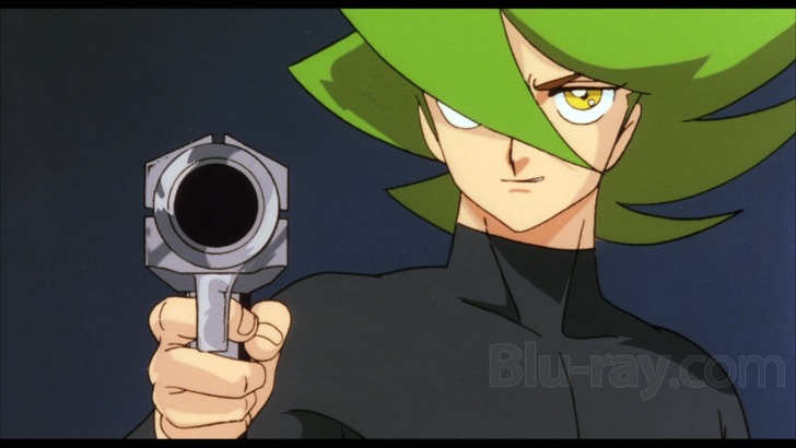 The animation impresses as one of the most essential elements of the production. The art work is clearly an example of 80's cell-based anime. Those who enjoy in the charms of the era will be enthralled by the setting and landscape. The style is super grim at times but with a cool sci-fi background. Featuring art direction by Yoshinari Kanebako (Go Nagai World, Legend of Lemnear), Locke the Superman is a strong production that does a superb job with character designs for the main cast. There is a sense of suave style on display: Locke and his ultra-green hair-do makes a strong visual impression throughout the feature-film.