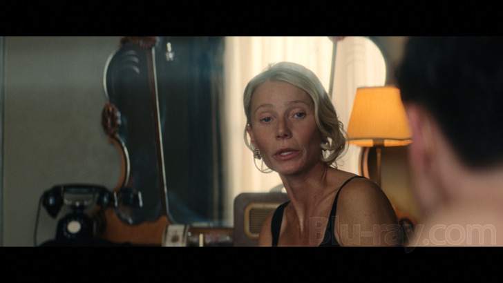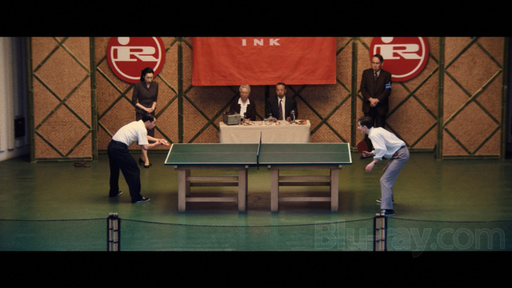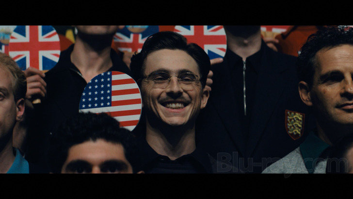 Marty Supreme is presented on Blu-ray with an AVC encoded 1080p transfer in 2.39:1. The closing credits offer "shot on Kodak film", though rather fascinatingly the workflow for this feature also had some (apparently minimal but still notable) digital capture utilized, with everything finished at a 4K DI. The result is incredibly appealing looking, with an absolutely homogenous appearance to my eyes, though there are some moments that are intentionally "distressed" looking, some of which evidently utilized 16mm. The ping pong action is so swift at times that admittedly a lot of what's in the frame can zoom by and be somewhat blurry, but in more stationary narrative moments, this 1080 presentation excels with fine textures on fabrics and sets in particular, all of which is aided by a rather sumptuous production design. The palette is rather interestingly subtle, especially in terms of some of the unusual combinations of tones offered in backgrounds, but everything looks healthy and natural throughout. Grain is tightly resolved throughout the presentation. Shooting on actual film can occasionally introduce "quaint" vestigial issues, and if you look at screenshot 19 at full resolution, you'll see what looks like a little fleck of missing emulsion on Marty's jacket.
