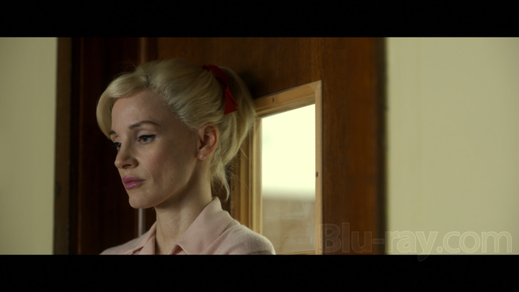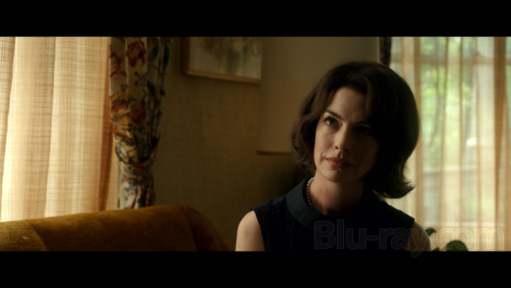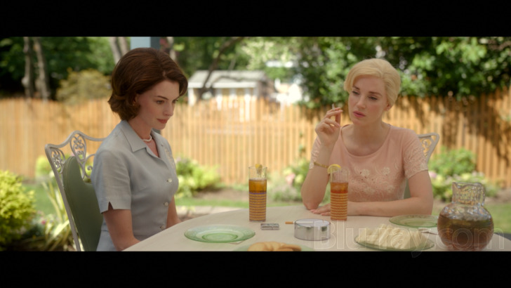 The AVC encoded image (2.39:1 aspect ratio) presentation handles the period appearance of "Mothers' Instinct." Color is inviting, with the production focusing on bold primaries for style options, including rich yellows and blues with Jackie Kennedy-esque choices. Greenery is distinct, as suburban yards are somewhat important to the plot. Decorative elements are also bright, with the whiteness of houses appreciable. Interiors offer a warmer sense of living spaces, with softer red lighting. Skin tones are natural. Detail is acceptable, offering a softer sense of skin particulars. Costuming, with its 1960s rigidity, is also decently textured. Exteriors retain depth, with a dimensional sense of neighborhood action. Interiors are also open for inspection. Delineation runs into a little trouble at times, leaning into solidification as evening activity arrives. Some brief, mild moments are banding are also detected.