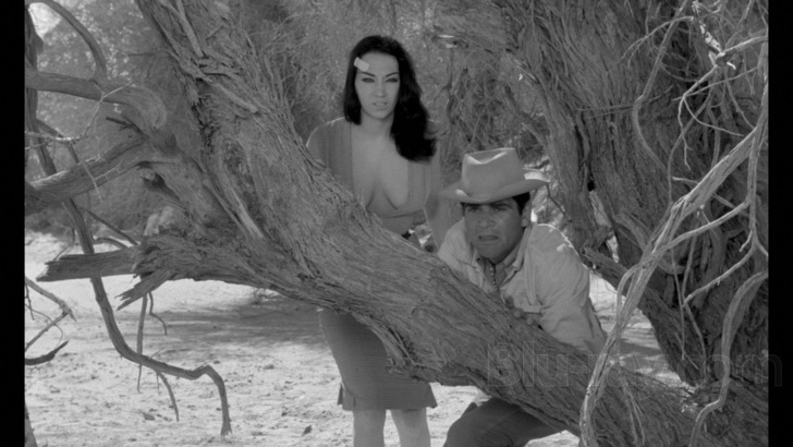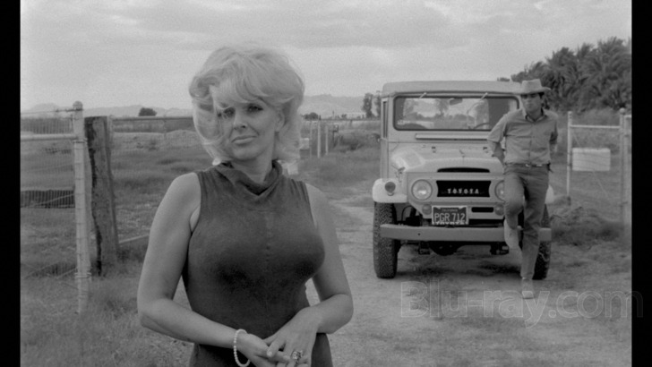 This 4K restoration was produced by the Museum of Modern Art (MoMA).All of the Meyer films released thus far by Severin have tended to look pretty spectacular, and despite this being the oldest and the only one in black and white so far, that "tradition" is continuing with this presentation, at least for the most part. I'd actually love to know why some sections of the film were sourced from an IP rather than the negative, and exactly where those sections might be, but one way or the other, while this offers a really solid accounting of the film's cinematography and location shoot, there are a few passing variances which may in fact be due at least in part to the variety of sources utilized. Clarity and grain grittiness can ebb and flow throughout the many outdoor scenes, but on the whole detail levels on everything from fabrics to swirls of dust left in the wake marauding "hogs" are very precisely rendered. The entire transfer struck me as intermittently a bit on the dark side, and that certainly is noticeable in some of the day for night material in particular, where black levels can spike and at least some detail levels become masked. HDR probably only increases the "ratio" between black and whites on display, and the perception of darkness in this 4K version is therefore arguably increased. As mentioned, grain can flare at times, especially against some of the bright desert sky backgrounds, but resolves without any major issues.