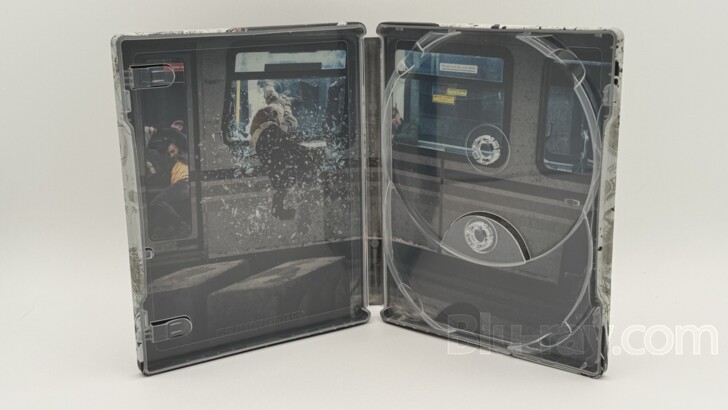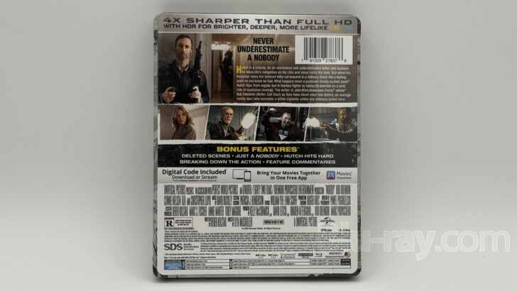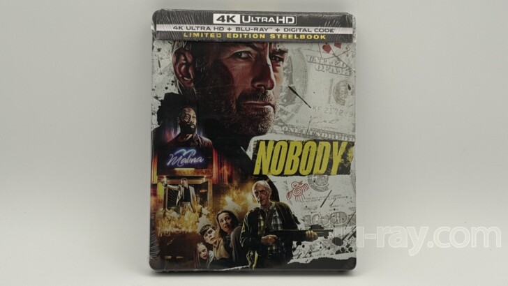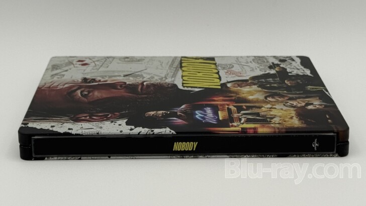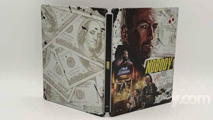 The cover of the new Nobody 4K Limited Edition SteelBook contains a collage of images of characters from the film. Odenkirk's Hutch dominates the top half of the image, his face sitting just off-center to the left. His telltale tattoo resides in the top right corner. Below it, the film's title is printed in yellow block letters on top of a black background. A shotgun-toting Christopher Lloyd is in the bottom at the center. To the left of him are Connie Nielsen (Becca) and the family's two children. To the left and slightly above them stands Yulien Kuznetsov (Aleksey Serebryakov), gun in hand, standing in the midst of flames with the neon sign of the trendy Malina aglow above him. Just above the sign is RZA's Harry Mansell. All of these images appear on top of a background of $100 dollar bills. The spine features the film's title in the same yellow font in a field of black. Universal's logo sits at the bottom. The reverse image is simply $100 dollar bills stained with what looks like a spattering of black ink. Universal's logo is centered at the bottom with a product number in the lower right corner Upon opening the SteelBook, the Digital Code resides under the two tabs on the left side. On the right side, the 4K UHD disc and the Blu-ray disc are stagger-stacked, each on its own hub, with the 4K UHD disc on top. Removing the discs reveals a two-panel image from the film of Hutch being thrown through the window of a bus. The SteelBook has a matte finish which resists fingerprints associated with normal handling very well. It's a nice package that conveys a bit of what the viewer can expect from the film.