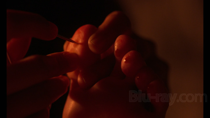 RLJ Entertainment's Blu-ray edition of Nocebo offers a largely pleasing presentation of what's ultimately a pretty cold film, supporting its varied but largely natural palette with a nicely saturated and defined 1080p transfer. Fine details are evident, textures are somewhat smoothed-over but not waxy, and shadow detail remains respectably good even during the film's occasional nighttime freak-outs. Black levels often run satisfyingly deep yet are sometimes prone to mild posterization, while harsh gradients likewise exhibit a bit of banding. Otherwise it's a fairly well-compressed disc -- not exactly a challenge for 96 total minutes of content, even on a single layer. And if nothing else, it's likely a few steps above the Shudder streaming version, which will make this a decent little upgrade for established fans.