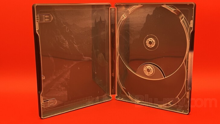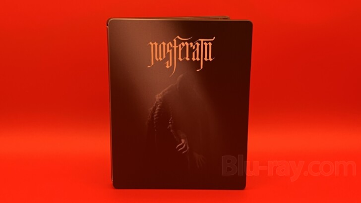 The cover of the new Nosferatu 4K SteelBook is every bit as spooky, mysterious, and shrouded in shadow as the film itself and leverages colors from a cold blue-grey to black. The white calligraphy-inspired font used for the film's title adds an additional sense of the ancient and the foreign to the image. Nosferatu (or Count Orlock) is there, but only partially illuminated. In the murky light, his gnarled right hand, only slightly more apparent than the barely visible left, suggests Count Orlock/Nosferatu is rather advanced in years, as does his stooped posture. Or is he something more animalistic? His face, however, is unknowable in this light. Using the same color pallet, the back offers a precisely lit image of Lily-Rose Depp's Emma, she being clearly visible from just below her eyes to just below her shoulders. Her eyes are little more than faint pinpricks of dim light in the darkness. A reflection of some unseen light source, perhaps? Or does it imply some type of possession, psychic dominance, the awakening of lustful thoughts and wanton desires, or some other infernal influence? The spine simply hosts the film's title in the same white font that appears on the cover but is so small as to almost be one of the contractual details in which the devil customarily hides. Neither Universal's logo nor a product number appear anywhere on the outside of the case. It's a clean, efficient, and highly atmospheric outer package. When opening the SteelBook, the Digital Code resides under the two tabs on the left side. On the right side, the 4K UHD disc and the Blu-ray disc are stagger-stacked, each on its own hub, with the 4K UHD disc on top. Removing the discs reveals a panoramic image of a carriage on the narrow mountain pass as it heads toward Count Orlock's crumbling castle. This interior image seems to move closer to a traditional black-and-white color scheme and the picture is again seen as if through a thin veil of mist or fog. Creepy, haunting, and filling the beholder with a sense of uncertainty and dread, it's a perfect design for a film such as Nosferatu, and the matte finish should resist fingerprints nicely.