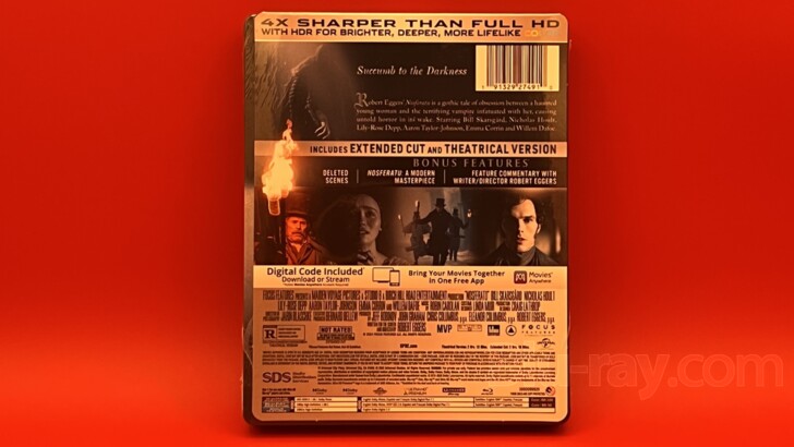 Arriving in theaters very late in 2024 and remaking the vampire's earliest appearance on the silver screen, Robert Eggers' new take on the silent- era classic of the same name, 'Nosferatu' arrives on 4K UHD in this new 'Nosferatu 4K SteelBook' courtesy of Universal. This modern retelling of F. W. Murnau's now 100-year-old silent-era masterpiece stars Lily-Rose Depp ('Yoga Hosers') as new bride Emma Hutter, Nicholas Hoult ('The Great') as her husband Thomas, alongside Willem Dafoe, Emma Corrin, and Bill Skarsgård as the monstrous Count Orlock. The 4K UHD release features a stunning 2160p presentation, a breathtaking Dolby Atmos audio track, and a reasonable assortment of on-disc supplemental material. For a discussion of this new SteelBook, please scroll down to the "Supplemental Features and Extras" section of the review.