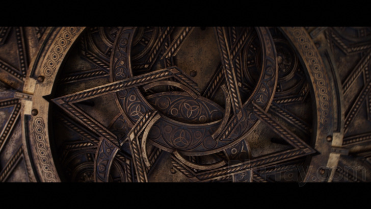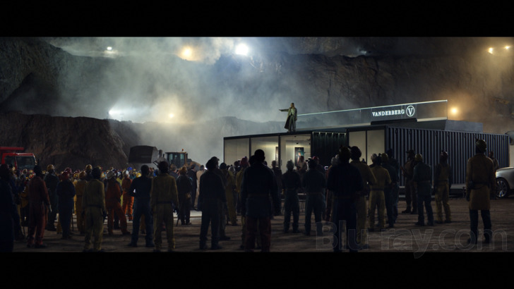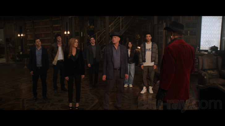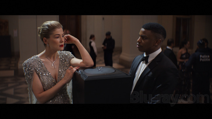 Now You See Me, Now You Don't is presented on Blu-ray courtesy of Lionsgate Films with anAVC encoded 1080p transfer in 2.39:1. The IMDb lists the Sony CineAlta Venice and a 4K DI as relevant data points. Fans of this film are probably best advised to opt for Lionsgate's 4K UHD release (which includes a 1080 disc), as both detail levels and palette get some nice improvements in that version. That said, this is a really beautifully sharp and well detailed looking presentation throughout, with some generally well woven practical and CGI effects woven into the mix at various points. Fine detail is convincing on all of the sets and costumes, and textures on things like Morgan Freeman's topcoat or some the gowns Rosamund Pike wears is nicely precise looking. Speaking of Freeman's topcoat, perhaps rather interestingly what might be called traditional visual "pop" can tend to be intermittent here, with the crimson tones of that costuming being a notable example. A lot of the early material with Pike in particular tends to exploit neutral tones in the white to beige to tan arenas, though interestingly later in the third act backgrounds featuring her character turn a more hellish orange. There do seem to be a couple of quick establishing shots that may have been sourced from stock or some kind of secondary footage, as they don't offer the same level of clarity and detail.