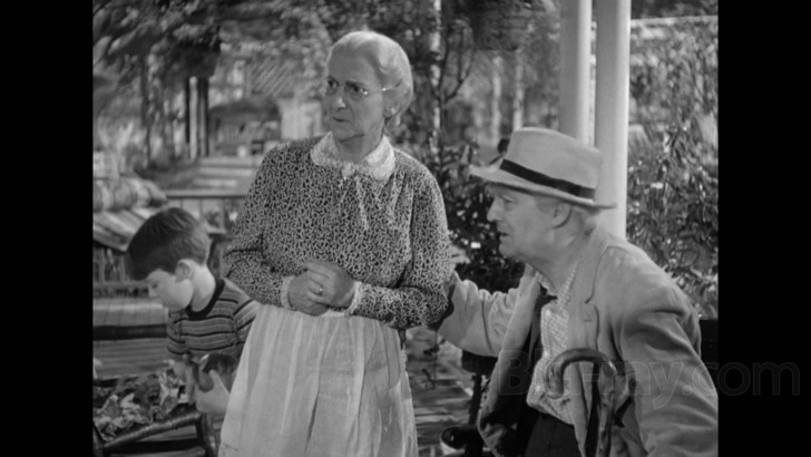 Warner Archive once again brings their A-grade restorative efforts to On Borrowed Time, whose original negative was surely one of many from MGM that was lost in the 1978 George Eastman House fire; luckily, the studio had undertaken a massive nitrate-to-safety conversion program in the early 1960s to create fine-grain master positives. As such, this surviving source was scanned in 4K and carefully cleaned using the boutique label's proprietary manual process, which as usual results in a very clean and film-like image that exhibits visible grain and all the fine detail you might get from a first-run theatrical presentation. The disc encoding is likewise solid and supports this film with a strong bit rate that typically runs in the mid-30Mbps range with no obvious compression problems. In short, those familiar with Warner Archive's expert treatment of this kind of source material should know exactly what to expect here.