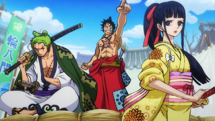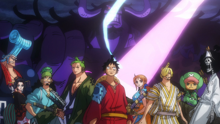 In the Land of Wano, Luffy races to get Otama to a doctor, and Zoro escapes execution before they battle Beast Pirate Basil Hawkins together. Later, after a close call with Holdem, Luffy links up with Zoro, Law, and co., fleeing on a stolen food cart. The group then heads to Oden Castle, where they hear the country’s history until a drunken Kaido attacks - leading Luffy to take him on.