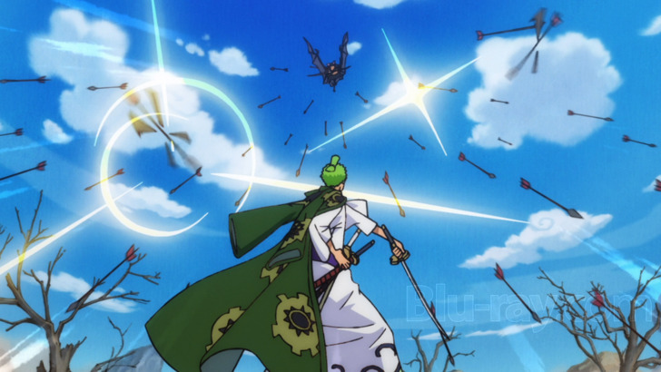 Zoro manages to avoid execution and the Straw Hat Pirates battle it out against the Beast Pirate Basil Hawkins. Luffy also encounters a close call with Holdem. Luffy, Zoro, Law, and others end up fleeing from peril with a stolen food cart.