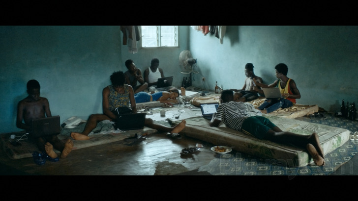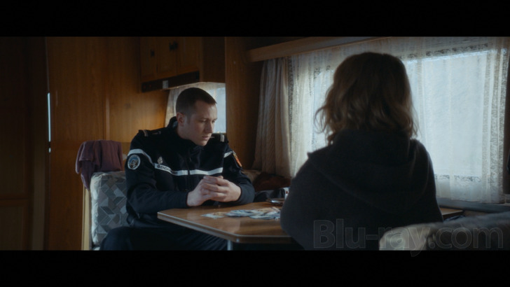 Only the Animals begins with a dark screen and what sounds like a blood curdling but still rather weird scream, which, once actual imagery begins, turns out to be the bleat of a goat which has been hog (goat?) tied and is (I kid you not) riding piggy back on an African boy tooling his bike down a street (see screenshot 16). That arresting image gets Only the Animals off to a rather memorable start, but the film then segues rather abruptly from Africa to a wintry France, where there is a home care aide named Alice (Laure Calamy) who is driving through a frostbitten environment, ultimately ending up at an isolated farmhouse, where she checks in on a possibly on the spectrum client named Joseph (Damien Bonnard). That "checking in" includes some sex, which seems to satisfy Alice more than it does the somewhat confused looking Joseph, and Alice soon departs, driving again across a barren, snowy landscape where she drives past what looks like an abandoned car, completely covered in frost. Back at her own farm, she has a few cursory interchanges with her husband Michel (Denis Ménochet), who seems intent on dealing with "accounts" he's managing on his computer, rather than really interacting with his wife. Meanwhile, Alice has turned on the television and the news is reporting the mysterious disappearance of a woman named Evelyne Ducat (Valeria Bruni Tedeschi), who of course owned the car that Alice had spied. Soon enough local policeman Cedric (Bastien Bouillion) is investigating the disappearance, and Alice, Michel and Joseph are among the presumed suspects, even if Cedric doesn't want to overtly announce that fact.