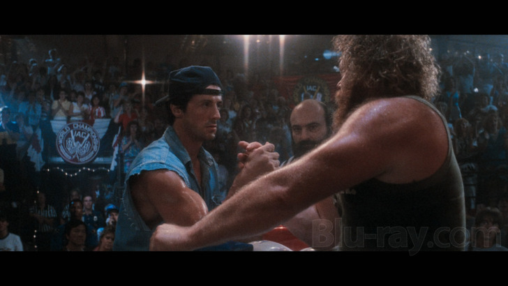 Sourced from what's most likely a recent 4K scan of the original camera negative, this 2160p/HDR10/Dolby Vision transfer of Over the Top absolutely catapults past Warner Bros.' 2009 VC-1 encoded Blu-ray linked above. Fine detail and textures are clearly visible from start to finish now, which not only increases the time-capsule appeal of various scenes but also strengthens close-ups and beautifies the assortment of establishing shots and other vistas seen during Lincoln and Mike's road trip, not to mention the neon backdrop of Las Vegas in the film's third act. Color representation is aided greatly as well, largely a result of HDR, resulting in a vivid but natural palette that doesn't seem to have been significantly altered from is roots. Film grain is present throughout, mostly fine but clearly visible, while modest depth is achieved thanks to strong shadow detail even in the film's darkest moments. This is an across-the-board upgrade to be sure, and one that's smoothly authored on a dual-layered 66GB disc with no obvious encoding issues, which isn't surprising at all given that there are only about 100 minutes of total content on here.