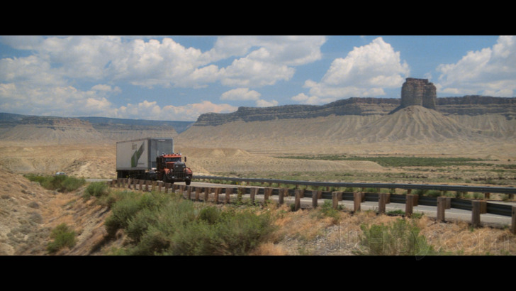 This two-disc release ships in matte-finish Steelbook packaging bearing the film's memorable poster on its front cover; it's further highlighted by debossing that gives certain elements a not-so-subtle 3D effect including the border (broken up by Stallone's name and the film's logo), as well as Lincoln's beefy forearm and fist. The back cover is comparatively more somber, again featuring Lincoln but this time in a reflective mood atop his rig. Testosterone returns on the interior print, a splash image highlighting his final showdown with Bull Hurley. Both discs sit on overlapping hubs on the right-hand side, and the Steelbook itself also slides into a practical "pocket" J-card with descriptive movie and disc info on the back. It's a solid packaging job that, in my opinion, suits the film's tone just about perfectly.