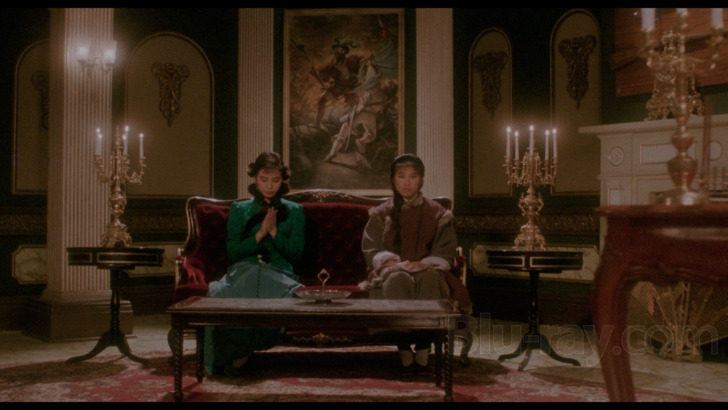 Both the UHD and regular Blu-ray impress in their rendering of primary colors during the opera's performance scenes and backstage moments. The set designs and costumes look outstanding. Shadow detail in darkly lit shots also stands out well. As you can see from my screen captures, Hang-Sang Poon's cinematography makes use of a lot of candles, lanterns, and carbon arc lamps. In certain shots, the lighting makes the image appear soft and more diffuse. Some of the exteriors have a flat and static look. For instance, I could tell that the exterior in Screenshot #25 features a matte painting.