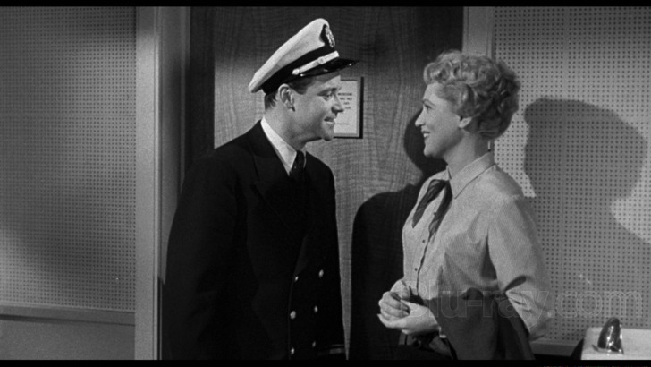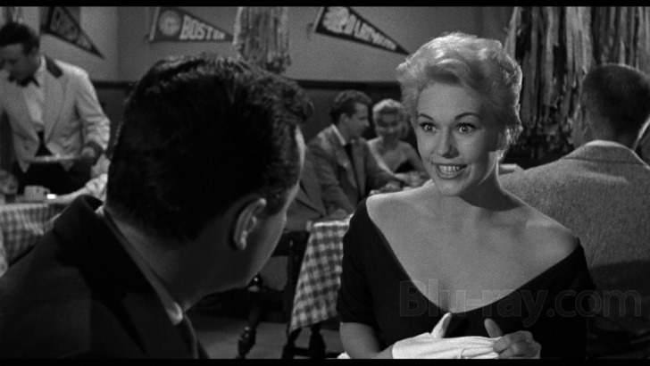 Kim Novak was something of an “it girl” for Columbia when this film came out, which is why she, rather than marquee stars Judy Holliday (at the time of this film’s release in 1954, a relatively recent Academy Award winner for Best Actress in Born Yesterday) and/or Jack Lemmon (himself just on the cusp of winning his first Academy Award for Mister Roberts in the Best Supporting Actor category in 1955), is front and center in the film’s trailer (presented on this Blu-ray disc as a supplement, as detailed below). Miss Novak takes a page from the Lauren Bacall book of putting your lips together and blowing by giving prospective audience members a quick guide as to how to pronounce Phffft!, finally winking seductively and cooing, “Don’t say it — see it!” Novak is definitely consigned to a supporting role in this film ( however you want to pronounce it), in a rather charming, freewheeling performance as a young woman named Janis, who is set up on a blind date with recently divorced Robert Tracey (Jack Lemmon), still nursing hurt feelings from his break up after eight years of marriage with (now) ex-wife Nina (Judy Holliday).