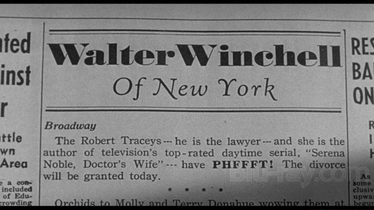 Phffft! is presented on Blu-ray courtesy of Sony Pictures Home Entertainment with an AVC encoded 1080p transfer in 1.85:1. This is not one of the top tier transfers we've seen from the typically reliable folks at Sony-Columbia, and this has a somewhat "dupey" look throughout, at least in terms of a pretty heavy grain field, even if contrast is generally very secure, with nice blacks and well modulated gray scale. Detail levels are certainly acceptable but rarely really impressive, though some things like the brocaded pattern on the Tracey couch generally look precise. There's recurrent if typically quite minor signs of age related wear and tear, including scratches, nicks, dirt and a few other blemishes. Grain, while heavy, resolves without any problems. There's one kind of peculiar moment with Nina walking down a hallway after getting her divorce that looks just slightly anamorphically stretched for some reason. My score is 3.25.