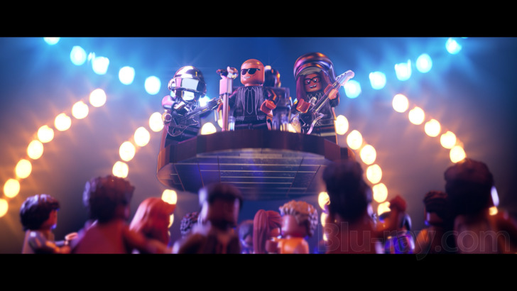 The English Dolby TrueHD 7.1 audio track is tasked with two primary chores: handling dialogue and reproducing music. It accomplishes both very well. Dialogue is almost exclusively located front and center as is appropriate for a film of this type. It's properly prioritized and is clear, clean, and understandable. Even when the music is the dominant presence, as is often the case, never a word is missed. The real star here, however, is the music, and the surrounds are leveraged to support it frequently and often. The first opportunity to appreciate the precision and fidelity of how music is rendered comes early, as a Stevie Wonder track fills the sound field when Williams recounts his love of listening to the artist over and over in his youth and experiencing synesthesia for the first time. Later, Gwen Stefani's "Hollaback Girl" provides a few moments to appreciate sharp horn flourishes, and later her group's (No Doubt) "Hella Good" allows percussion to take the forefront, coupled with crisp guitar work and throbbing synths. As is necessary for most of the songs that he produced, performed, or that influenced him, bass is of critical importance. Here the track once again does not disappoint, and the thumping bass adds depth and power when it is called upon to do so. Sound effects are also accurate and include delicately clicking LEGOŽ pieces as scenery and objects magically assemble themselves, car wheels, closing doors, and the fantastic and room-rumbling moment when Future Records lands in Virginia Beach. Directionality is precise, and objects including jets, birds, and flying LEGOŽ pieces move realistically from front to back and side to side. The track is frequently immersive, and one of the track's most playfully enveloping moments recounts the iterative process of crafting Snoop Dogg's "Drop it Like it's Hot" in the studio and then following it to the stage at the Staples Center in its finished form. It's a great track.