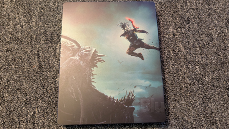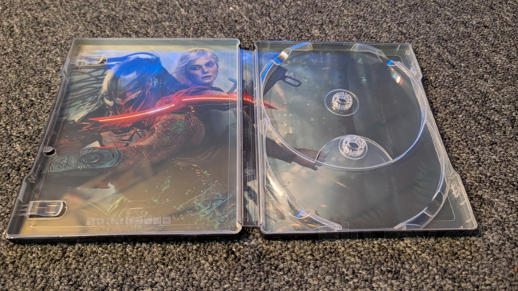 On disc supplements are detailed in the above linked review. The SteelBook features a moody front panel with a matte finish in cool blues, greens and grays featuring the film's protagonist arguably jumping out of the fire and into the veritable frying pan. The back panel simply offers the rest of the film's nemesis beast. The interior panels feature an illustration of the pair of combatants who join together to defeat a common enemy (see hi res photo 5). A digital copy is also included. A J card wraps around the top of the SteelBook, and offers the typical plot summary, list of supplements and credits information on the back side.