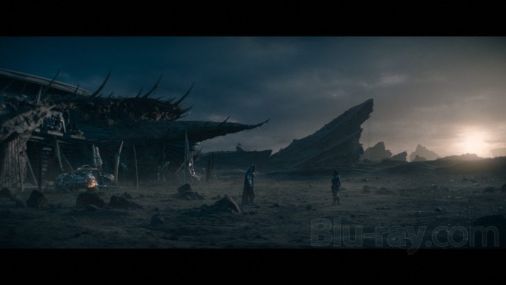 Predator: Badlands is presented on Blu-ray courtesy of 20th Century Studios and Disney / Buena Vista with an AVC encoded 1080p transfer in 2.39:1. The IMDb lists the Arri Alexa Mini and a 4K DI as relevant data points. This is another stellar (no pun intended) looking effort from Disney, though I'll cut to the chase and once again recommend those with the appropriate equipment to pick up Disney's 4K UHD release if they're fans of this film. One way or the other, this 1080 presentation is a knockout on its own merits, with excellent detail levels across the board and a really nicely suffused palette. Kind of interestingly in terms of actual visual "pop", Yautja Prime kind of emphasizes "desert" tones like taupes and ochres, leaving some of the first "wow" hues to be perhaps unexpected moments like the bright green blood that spills during a showdown between Dek's father and brother. Once things get to Genna, the palette is considerably "normalized", though still obviously toyed with in post, giving the forested scenes a just slightly unreal, (appropriately) alien appearance. Fine detail on all of the practical sets and costumes, along with the location work, is excellent and the CGI elements are very artfully interwoven into the tale, with some appealing textures and detail levels on any number of creatures. All of these aforementioned aspect can see upticks in both detail and palette highlights in the 4K version, but divorced from that comparison this 1080 presentation is very impressive.