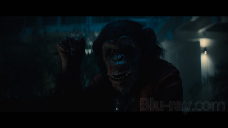 Primate is curiously a Blu-ray only release, but even limited to 1080p the picture excels beginning to end. The image pushes the Blu-ray format towards its upper limits, delivering an exceptionally crisp and satisfying picture with sharp, high end details and firm, unwavering colors. The image thrives in its ability to deliver perfectly clean and accurate details, especially in the early going where sets are well-lit, but even as the action transitions to the nighttime pool exterior, there's no missing the razor sharp clarity on display. Small details outside around the pool look great, as do the characters themselves. Viewers will see every drop of water running down skin as they bunch up in the pool in search of safety. The Blu-ray is also more than capable of capturing every fine detail on Ben's face and furry body, even in low light. Definition never wavers, even in challenging light. Color output is rock solid as well. Again, the nighttime, poolside exteriors thrive, especially with the pool water contrasting against the darker elements around the periphery. It makes for some dramatic visual contrasts, and the color holds up in every shot. Black levels are crucial to the film, and there is no wavering from a very firm, accurate presentation. Flesh tones look spot-on as well, again regardless of lighting conditions. There is no significant noise to contend with, and the encode appears to be in top shape.