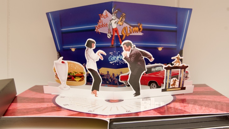 The main draw here is the slipcover with a flap that opens up like a children's pop-up book that shows the classic dancing scene with Vincent and Mia
