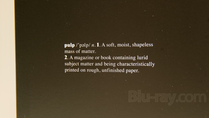 black slip box with the film's title emblazoned in bold yellow across the front and a dictionary entry for the word "pulp" on the back.
