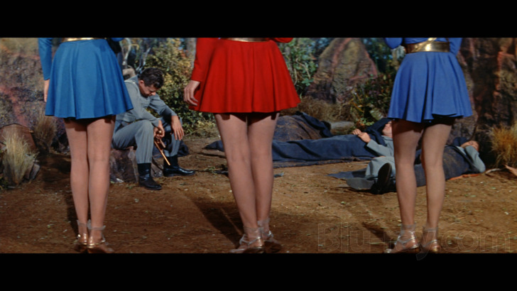 Shot in DeLuxe Color and CinemaScope, Queen of Outer Space looks quite good on Blu-ray from Warner Archive; not consistently as tack-sharp as similarly-formatted films from that era, but certainly much better than expected for low-budget fare like this. As seen in these direct-from-disc screenshots, fine detail is quite impressive in the right conditions and the gaudy color palette gets a lot of chances to shine. The relatively flat staging, occasionally odd framing choices, ultra-soft establishing shots and stock footage (some of which is stretched horizontally), and far-less-than-convincing visual effects add their own lo-fi charm, with only the latter occasionally reflecting an unavoidable but temporary drop in clarity. The bottom like is that the wide, wide majority of Queen of Outer Space is on par with some of the boutique label's very best restorations, and that alone should sell this disc to interested parties who don't own it yet.