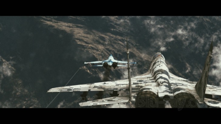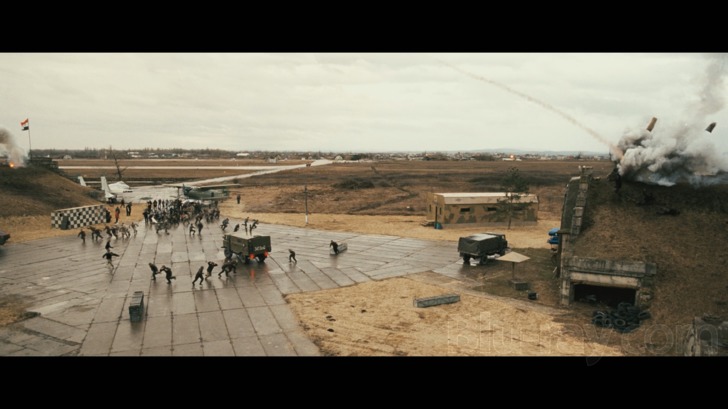 Specific information about the shooting format of Red Sky was not available, but judging from appearances, the film was probably shot digitally. The credits indicate that post-production was completed on a digital intermediate, so that Inception Media's 1080p, AVC-encoded Blu-ray was presumably derived directly from a digital source. The credited cinematographer is Ronald Hersey, who has extensive experience as an aerial and second unit DP on major studio films such as Ender's Game and White House Down. Much of Red Sky's visual style was no doubt dictated by the CG work needed to achieve the flying sequences. In general, though, the image is reasonably sharp and detailed, with a palette that tends to be either very bright or exceptionally dark (as in, e.g., the high level defense meeting), probably to help conceal the lack of budget for extensive set design. The colors are generally realistic on the ground and slightly pale in the air, with the blues of the sky notably light, but this appears to be by design. Fleshtones look accurate, and the orange fireballs of multiple explosions look like classic movie pyrotechnics. The blacks in caves and bunkers look accurate, although there is some indication of overbrightening in some of the nighttime scenes, e.g., in St. Petersburg. Here again, this may simply reflect the source. Inception has mastered the 108-minute film with an average bitrate of 20.00 Mbps, which is adequate for digitally originated material, though less than optimal for a film with so many high-octane action sequences. Still, artifacts did not appear to be an issue.