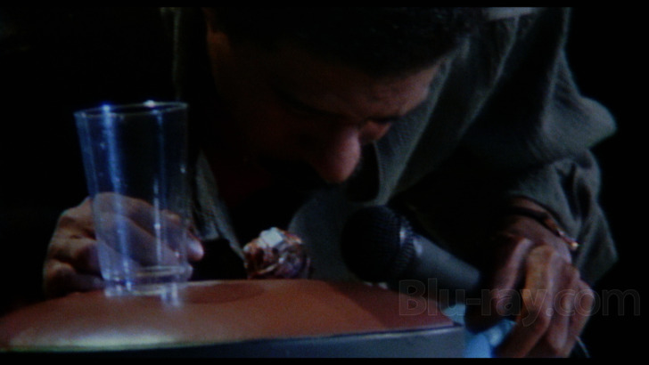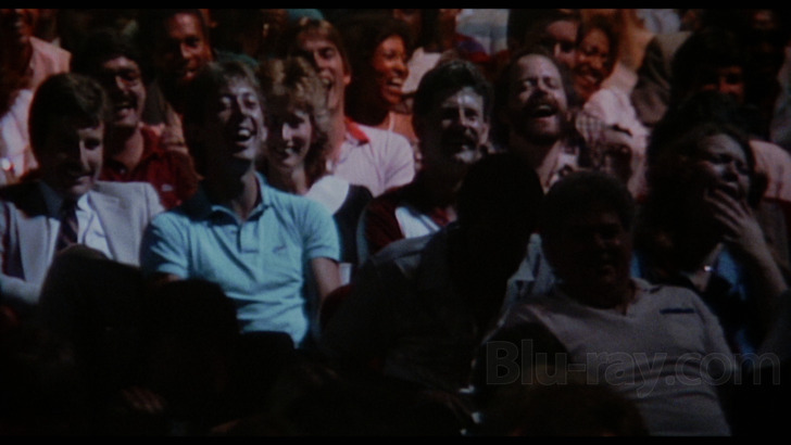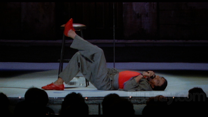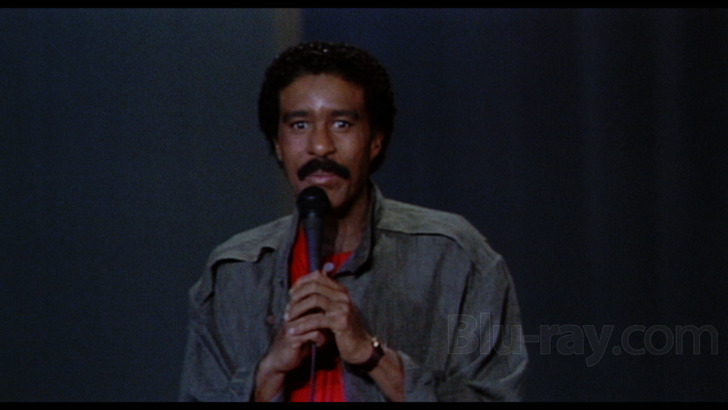 Hues are mostly drab by default with only Pryor's coordinated red shirt and shoes standing out against a sea of grays, browns, and pale blues, although the varied audience lighting (screenshot #3, below) at least generates a bit of depth and interest. Grain is decently handled for the most part, usually even appearing pleasingly organic, but it often battles with chunky noise in darker areas and again tends to get overshadowed by source shortcomings.