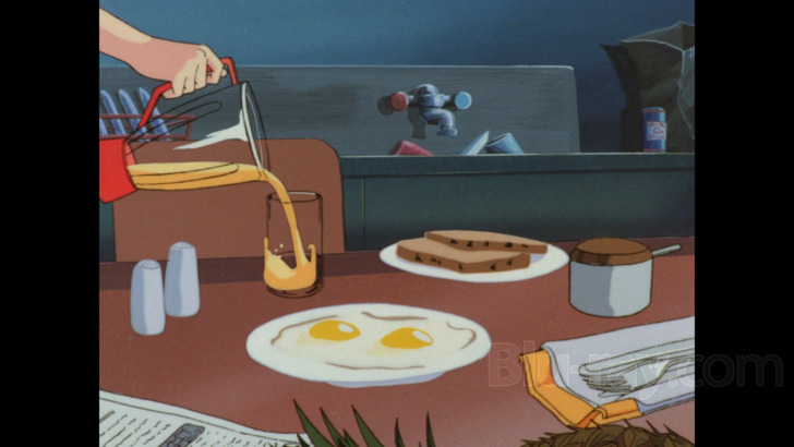 Released on Blu-ray by AnimEigo, Riding Bean is presented in 1080p MPEG-4 AVC encoded high-definition in the original aspect ratio of 1.33:1 full frame. The high-definition transfer impresses throughout. The old-school hand-drawn animation looks incredible on the release. The lush and engaging native high-definition scan provides a robust and filmic presentation. Outstanding and well-encoded by AnimEigo.