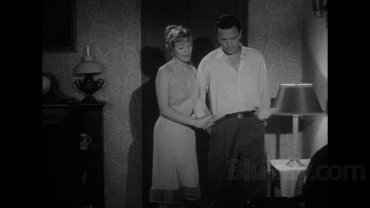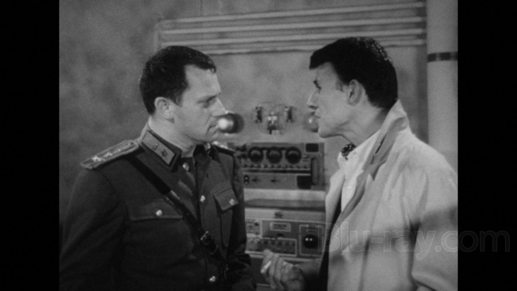 Rocket Attack, U.S.A. is presented on Blu-ray courtesy of Film Masters with AVC encoded 1080p transfers in either 1.37 or 1.85:1. Perhaps just slightly hilariously, while the IMDb lists 1.37:1 as the original aspect ratio, I almost wonder if 1960 screenings may have been in 1.66:1, as the 1.37:1 framing here often has a lot of headroom while the 1.85:1 framings conversely often chop off the tops of heads. The aspect ratio conundrum is just one issue here, though, and as can probably be seen by the screenshots (in both aspect ratios) I've uploaded to accompany this review, this appears to be a secondary (possibly tertiary) source element that is kind of muddy looking, with anemic contrast and pretty consistent deficits in fine detail. There's also recurrent if typically minor age related wear and tear.
