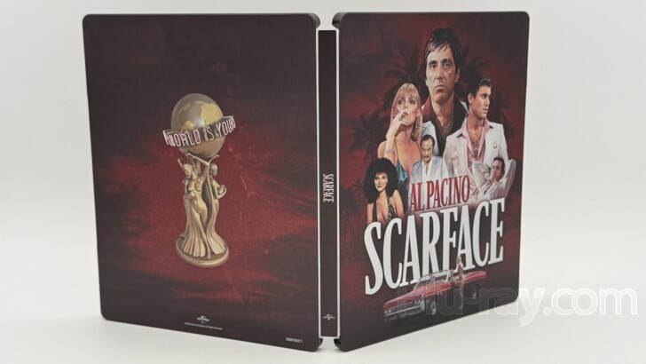 holds the film's title in the center, and Universal's logo at the bottom. Both are white. The back cover features Montana's "The World Is Yours" statue.