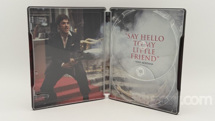 Director Brian De Palma's classic 1983 gangster picture 'Scarface' returns to 4K UHD disc in the new 'Scarface: Amazon Exclusive Ultimate Collector's Edition SteelBook 4K'. Packaged in a sleek, spot-glossed box, a metal poster, a hanging solution for the poster, and a certificate of authenticity are also included with the exclusive SteelBook. The discs included in the new SteelBook (a 4K UHD disc and a Blu-ray) are identical to those of the previous 4K release. A Digital Code redeemable through Movies Anywhere is also included. Please scroll down to the 'Special Features and Extras' section below for a discussion of the newest SteelBook and the other contents.