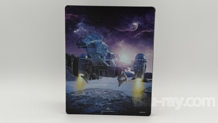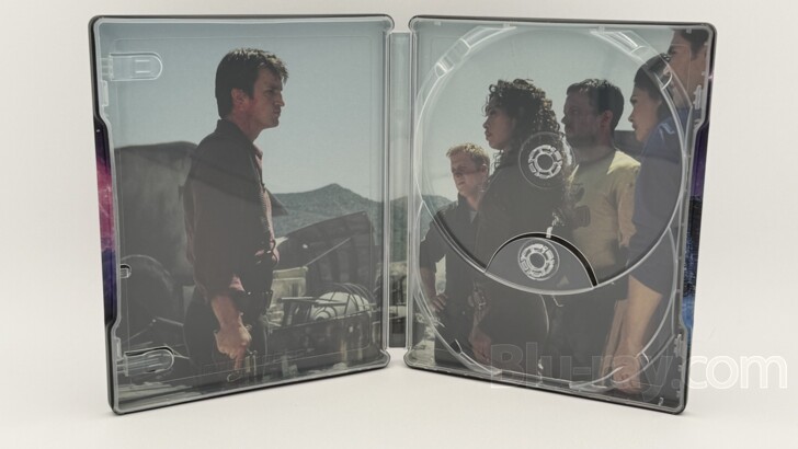 The cover of the latest Serenity 4K 20th Anniversary Limited Edition SteelBook contains a front image that is dominated by Summer Glau's River. She's well-armed, and appears to be ready for a fight. Her kneeling figure is floating in front of a planet, with the crew's ship flying toward the viewer. A purplish nebula is positioned behind the planet, and the film's title sits near the top of the image, surrounded by the blackness of space and a few stars. The spine sports the film's title in the same font in a field of black, with Universal's logo at the bottom. The reverse image captures the Serenity as it either taking off or landing at a rocky patch of land, with stars and purple cosmic clouds filling the skies above it. Universal's logo is centered at the bottom and product number is found in the bottom right corner. When opening SteelBook, the Digital Code resides under the two tabs on the left side. On the right side, the 4K UHD disc and the Blu-ray disc are stagger-stacked, each on its own hub, with the 4K UHD disc on top. Removing the discs reveals a still from the film of Fillon's Mal confronting five members of his crew during a particularly tense moment. The SteelBook has the preferred matte finish which resists fingerprints associated with normal handling very well. The cover image is colorful, it makes sense to spotlight Glau's River as she is one of the show's most dangerous, and enigmatic characters who factors heavily into the story here, and it looks quite nice in-hand.
