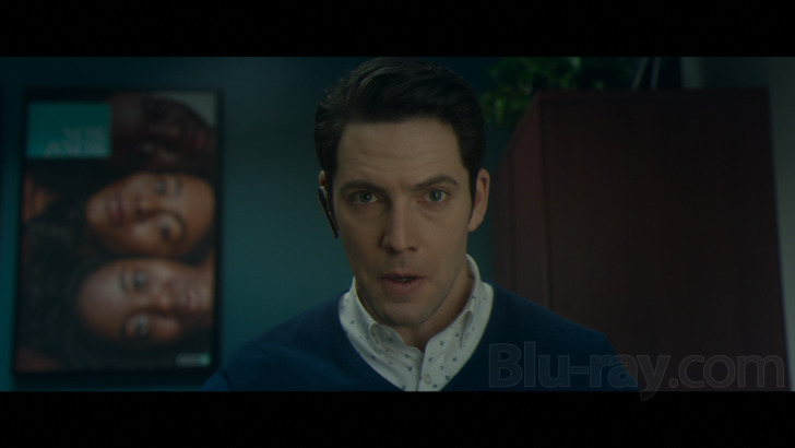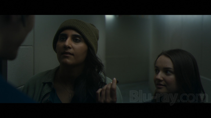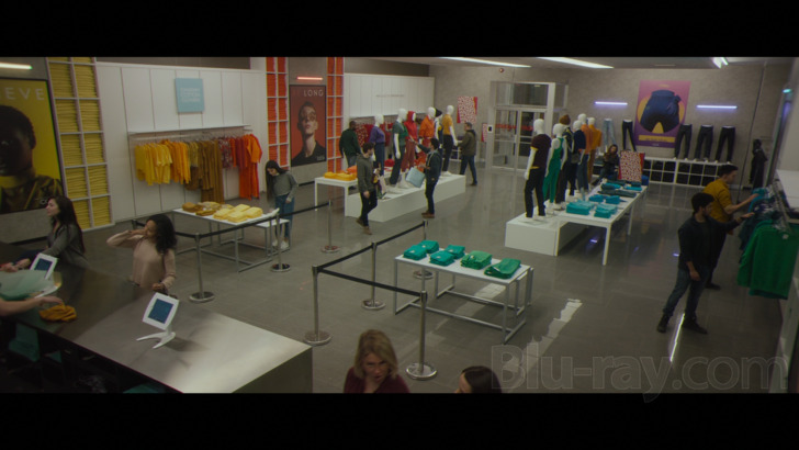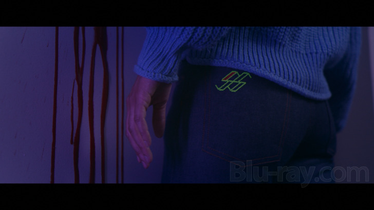 The visual presentation (2.38:1 aspect ratio) for "Slaxx" struggles with compression issues. Banding and posterization are spotted throughout the viewing experience, with some major flare ups in the warehouse finale. Detail is acceptable, examining the fibrousness of clothing options, including the killer jeans. Skin particulars are present, and gore zone visits textured. Store interiors are dimensional. Color is decent, especially around clothing collections, which register with defined primaries. Blood red is distinct. The cool blueness and greeness of backroom/bathroom action registers as intended. Skin tones are natural. Delineation is satisfactory.