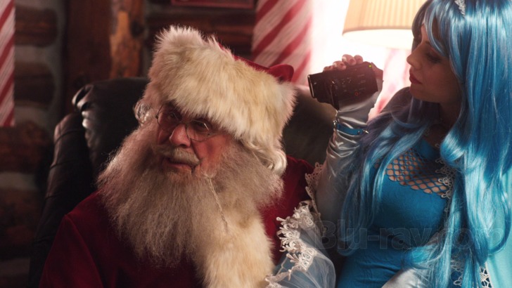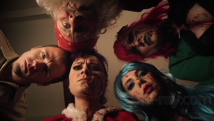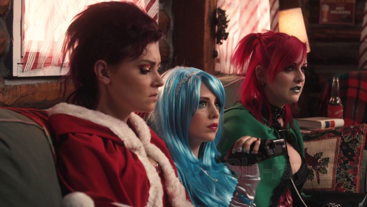 Color is a major event during the "Slay Belles" viewing experience. The AVC encoded image (1.78:1 aspect ratio) presentation does very well with Christmas hues, blasting the screen with reds, blues, and greens from direct lighting sources and background mood enhancers. Skintones are natural. Sharpness carries throughout, with defined facial surfaces and costuming, which is loaded with all sorts of soft and shiny textures. Krampus construction is defined as well. Delineation handles adequately, though the HD-shot feature isn't always interested in presenting pure blacks. Some banding is detected.