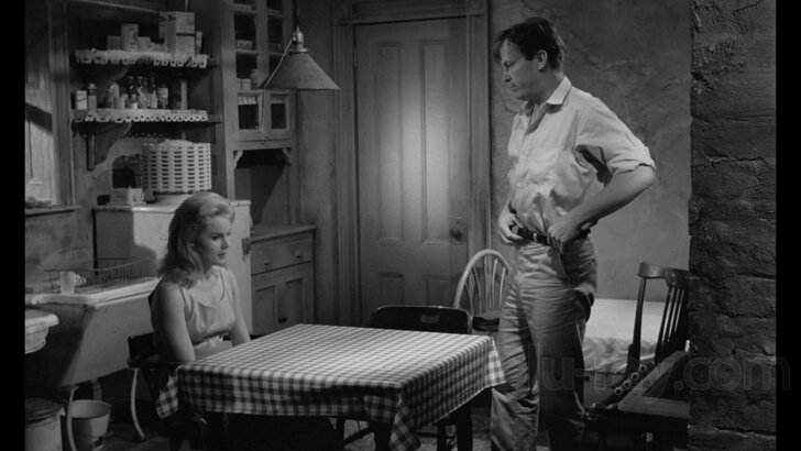 Kiss Me Deadly) who has quietly followed her from afar. The man then takes her to his place, offers her a meal, and invites her to stay for as long as she wants. When later that night he returns intoxicated and attempts to touch her, she hits him and seriously injures his left eye. On the following day, the man apologizes for harassing her, not realizing that now he has to wear a black patch over his eye because of her. They eat together, exchange a few words, and he invites her to stay a few more days. Eventually, Mary Ann decides to leave but discovers that her savior isn’t willing to let her go.