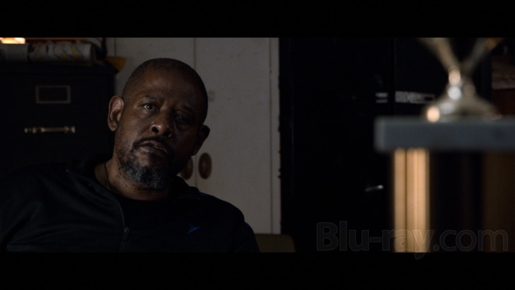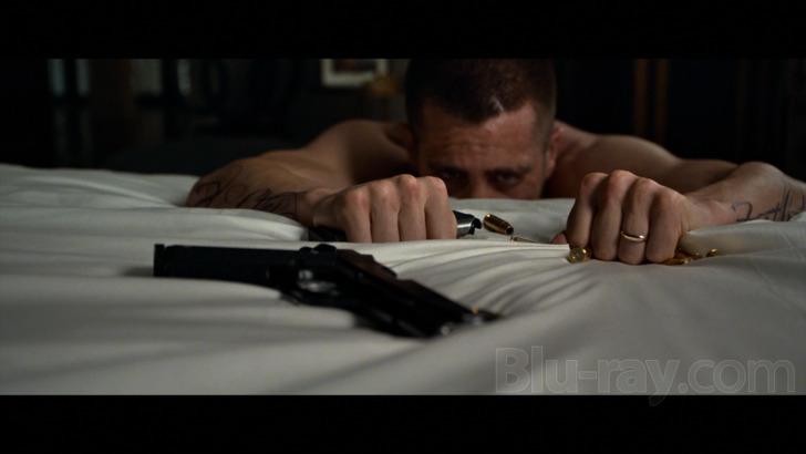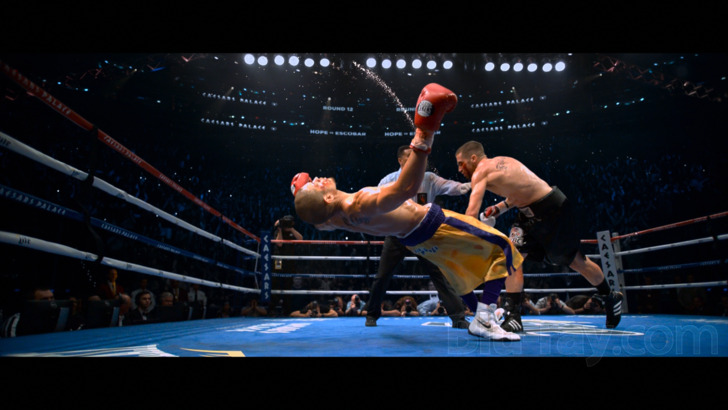 Southpaw is presented in 4K UHD courtesy of Lionsgate Films with an HEVC / H.265 encoded 2160p transfer in 2.39:1. The film was captured with a variety of cameras and had a 2K DI according to the IMDb. Marty was quite pleased with the now fairly old 1080 release of the film, but this 4K version shows some nice if subtle upticks in fine detail and (probably more noticeably) some lustrous highlights courtesy of the HDR / Dolby Vision grades. The HDR is immediately noticeable in the Madison Square Garden opening, where both reds and blues have considerable pop that is even more impressive than in the great looking 1080 presentation. Blues in particular throughout the presentation have a wider range of hues in this version, albeit sometimes consigned to backgrounds. I wouldn't argue that the HDR grades significantly improve shadow detail, and a few of the darkest scenes in the film still have slight deficits in visibility. Detail levels are typically excellent, to the point that some of the gruesome injuries Billy endures are positively gut wrenching at times to see. Digital grain is definitely present, but isn't especially overpowering, which in my estimation is a good thing. As can be seen by comparing screenshots, even the 1080 disc in this release sports more vivid suffusion and a slightly warmer color timing than the old 1080 release.
