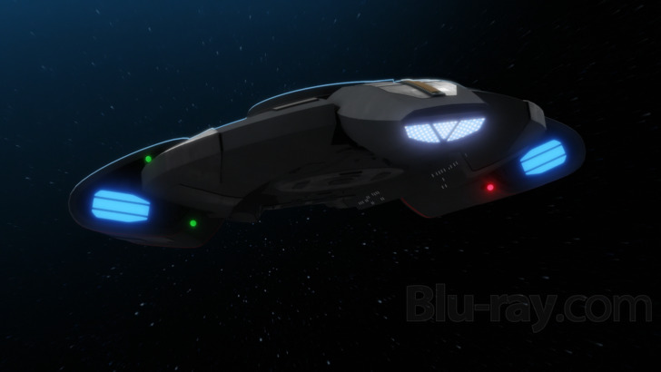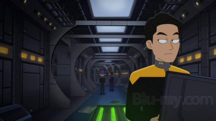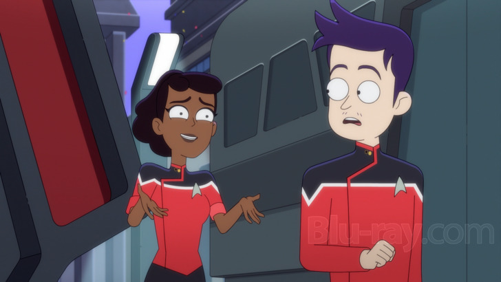 As usual, Paramount has released a wonderfully crisp and vibrant Blu-ray release for a Lower Decks season release. Spread across two discs, the episodes have plenty of room to breathe on the 50GB discs. The 1.78:1 images are sharp and revealing with the resolution more than capable of delivering the kind of efficient and revealing content fans expect. The resolution capably presents all the details on what is generally less than complex animation. Sure, there are some dense readouts on bridge instruments, but things like uniforms, basic surfaces around the Cerritos, and skin lack any tangible nuance. It's not a complex animation, and the 1080p resolution brings whatever is thrown at it to the screen with the highest of clarity and distinction. Colors are where the image really shines. The Starfleet uniforms are beautifully bold; each hue looks perfectly true to the TNG universe, delivering robust reds, bold blues, and great golds, with splashes of additional color always looking rich and brilliant. Black levels are fine (though "black" uniform areas can veer very lightly gray). If there is a drawback here, it's that there are a few jagged lines here and there, but for the most part everything is crisp and straight. I did not notice any other serious source or encode issues to report.