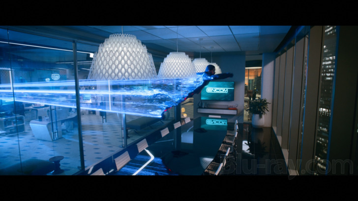 Once again Disney splits the difference with this 1080 disc getting a perfectly great sounding DTS-HD Master Audio 7.1 surround mix, but with the 4K UHD disc offering a probably at least marginally more immersive Atmos track. While the Atmos track probably offers verticality that isn't prevalent in this traditional 7.1 version, that's not to suggest there's not immense immersion throughout this version. Some of the establishing shots both out in the real world and in various grids offer really noticeable and enjoyable simultaneous engagement of all the surround channels to detail the various environments and several scenes like those featuring lightcycles (again, both inside and outside of the grid) offer some great panning effects. I'm probably going to invite some umbrage by saying I wasn't all that fond of the score by Trent Reznor and Atticus Ross, here reverting (?) to their Nine Inch Nails branding. To cite just one example, an early scene showing Eve zooming through frozen tundras on some kind of skimobile is set to absolutely ponderous block chords instead of something, you know, moving, as in maybe some kind of arpeggiated figure to indicate forward propulsion. That said, the score is very spaciously presented throughout. Dialogue is rendered without any problems. Optional subtitles in several languages are available.