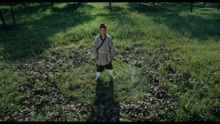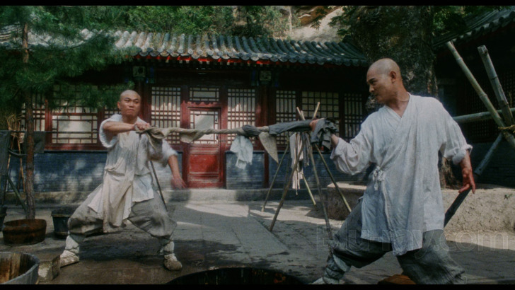 I own Vivideni Visual Entertainment's Blu-ray from fifteen years ago and have compared a handful of screenshots from that transfer with the two Shout! discs. Jeff observed damage marks on the source print used but they are completely absent here. He also noted general softness. After watching both the 4K and recent Blu-ray, I believe this can be attributed partially to the shooting conditions. A lot of scenes in Tai Chi Master were filmed with overcast skies, which are apparent during the main titles (see Screenshot #11). The 4K handles shots of rainstorm well. For example, see Jun Bao (Jet Li) laying in the grass in frame grab #18. Grain is abundant at times but never becomes chunky. Colors are better saturated on the UHD compared to on the Vivendi. For instance, the dark red paint on the doors of the Shaolin Monastery stand out more on the Shout! transfers (cf. #s 35-37). The image on the Shout! discs also boasts superior contrast. Notice how dark Tien Bao (Chin Siu Ho) and especially Jun Bao appear as they kneel in prayer before their master in Screenshot #26. The two friends' skin tones look brighter and clearer on the Shout!. In addition, contrast is improved in a wide shot of a field where Jun Bao and Siu Lin (Michelle Yeoh) walk together (cf. #s 38-40).