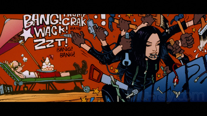 There are two sound options for "Tank Girl," including a 5.1 DTS-HD MA track that does the trick. Dialogue exchanges are supported throughout the listening event, securing performance choices and emotional moods. Scoring supports with passable emphasis and clarity with instrumentation. Soundtrack selections are defined, with sharp vocals. Surrounds are active, exploring action elements and room depth with appreciable atmospherics and sound effects. Low-end follows industrial activity and violent encounters. The 2.0 DTS-HD MA stereo mix is also a fine listening experience, delivering a more immediate and slightly fresher experience. Width is secured and movement is present. It obviously lacks more immersive appeal, but it's almost preferrable with its energy.