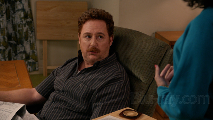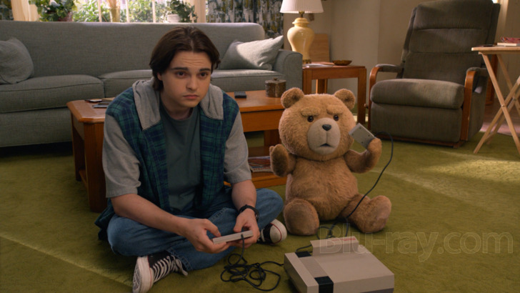 Universal has provided Ted: Season One with a very sharp looking MPEG-4 AVC encoded 1080p transfer. Colors are nicely saturated and realistic providing appropriate vibrancy to the series' world of 1993. Primaries represent with a decided pop as evidenced, for example in the costumes at the Halloween party and the downtown environment. There is an almost palpable tactile presence to fabrics like the Bennett family's couch upholstery and Blair's chunky knit sweaters. Ted's fur likewise looks realistic. Individual strands of his fur are discernable with a nice mix of fluffy and matted fibers, and discernably longer fur on his body than on his muzzle. The same holds true with the human cast members. Facial details like Matty's ginger stubble and Blair's period-accurate make-up are also open for inspection. Skin tones are healthy and true across the board. Exterior mid- and long-range shots can sometimes lack the precise environmental particulars visible in set-bound locations like the school interiors. Mr. George's classroom, for instance, is loaded with well-defined books, posters, and knick-knacks, where even the fake wood grain on the desks is easy to spot.