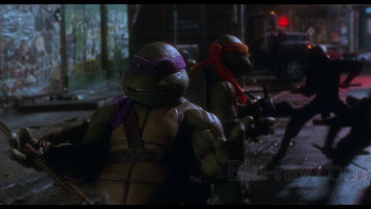 Teenage Mutant Ninja Turtles is presented in its original aspect ratio of 1.85:1 with stereo and a new Dolby Atmos mix. The film is presented in 4K resolution in HDR10 and Dolby Vision.A somewhat blurry looking New Line Cinema logo and then an extended credits sequence may be a less felicitous way to start things off, but once things get officially underway, this is an impressive 1080 presentation, though my hunch is reactions an often very thick grain field may be as variable as the grain itself (more about that in a moment). This new transfer's strengths are apparent virtually from the get go, with appealing detail levels and especially with regard to a very nicely suffused palette. The film's emphasis on dark, almost quasi-noir framings, may admittedly lead to some deficits in shadow detail at times, but blacks are often sumptuously deep and contrast generally consistent and helpful in providing pops of vibrant color in things like glowing neon signs. Fine detail on everything from the Turtles' rubbery suits to Splinter's hairy face is generally excellent. In terms of the variable thickness of grain, I've often stated how when any given shot on film production is released simultaneously in 1080 and 4K that I can tend to prefer the look of grain at the lower resolution and in SDR, but I have to say grain is pretty much just as variable and often chunky looking in this presentation as it is in Arrow's 4K release. For just one interesting example of how variant grain thickness and resolution can be, pay attention to how really nicely tightly resolved the grain field is in some outdoor material starting at just past the 39 minute mark, which then suddenly gets a good deal chunkier and considerably more yellow.